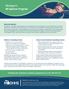LANSING, Mich. – The Michigan Department of Health and Human Services (MDHHS) has launched a statewide MI Options system, offering free and comprehensive person-centered options counseling for adults looking for long-term care services and supports. Medicare counseling is also offered through the State Health Insurance Assistance Program and Medicare Improvements for Patients and Providers Act program for those navigating enrollment or reenrollment.