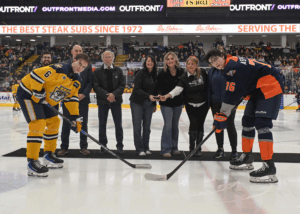 To commemorate the evening, Julie Forbush of Sovita Credit Union, Shannon Ciszek of Genesee Health Plan, and Stacey Doyle of the Genesee County Free Medical Clinic, were welcomed to the ice to participate in the ceremonial puck drop. The puck drop not only signified the start of the game but showcased the power of partnership in the Flint and Genesee County community.
