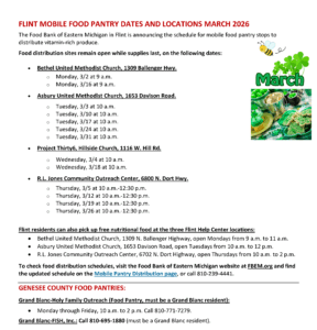 March Flint Mobile Food Pantries announced by the Foodbank of Eastern Michigan, and Michigan Department of Health and Human Services. For more information, call (810) 239-4441 or visit https://www.fbem.org/programs/mobile-pantry-distributions/