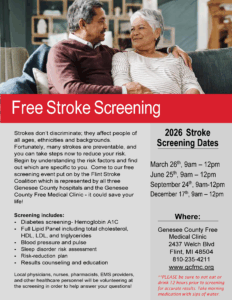 The Genesee County Free Medical Clinic is providing a series of FREE Stroke Screenings throughout 2026 from 9am-12pm.