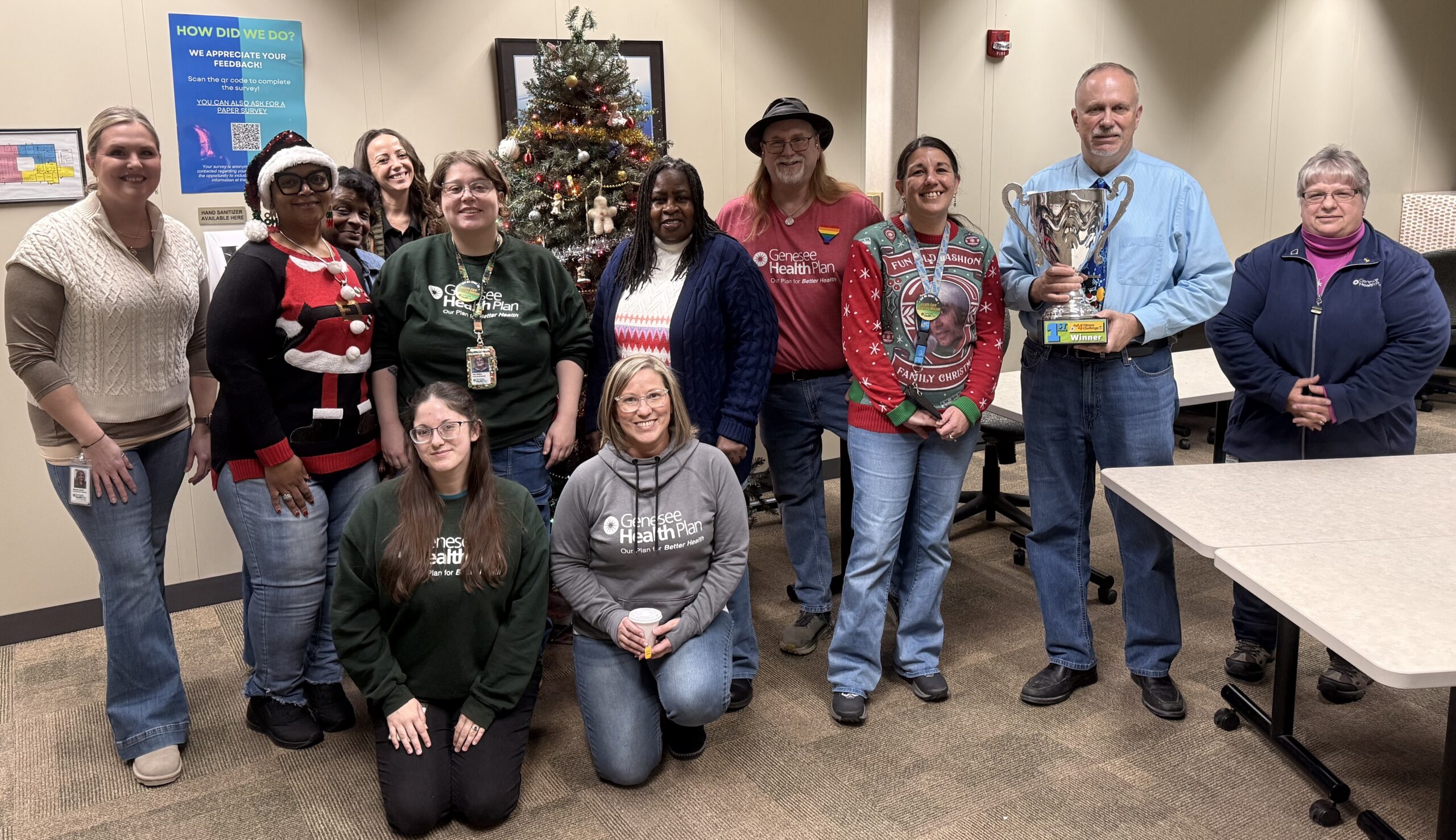 GHP staff put their health first by participating in the Commit 2 Fit Fall 4 Fitness Challenge again this year. Walking laps at the office and raking leaves at home not only helped our staff stay healthy but led to a first place win in our division of the competition! Genesee Health Plan has proudly participated in this challenge every year, resulting in past first place wins in 2015 and 2021. Staff gathered on Friday, December 19th to celebrate and take a group photo. We were excited to welcome the first-place trophy back to the GHP office!