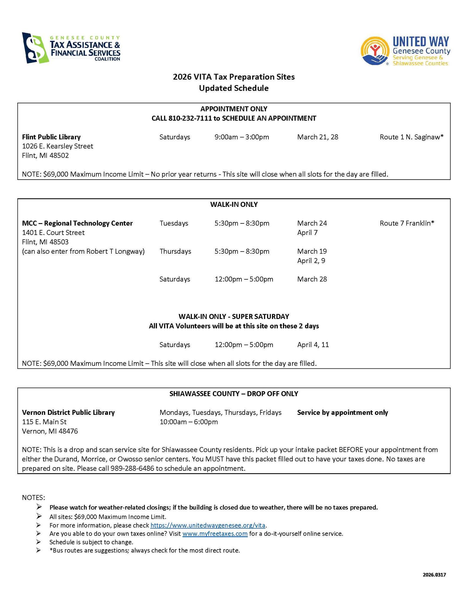 Low-to-Moderate income families in Genesee County can file their taxes for free with a professional through United Way’s Volunteer Income Tax Assistance (VITA) program. VITA is a volunteer run program in partnership with the IRS to help families access the EITC and other credits that can boost financial stability. The schedule below list sites and times for walk-in and drop off tax preparation. Click here for a printable version!