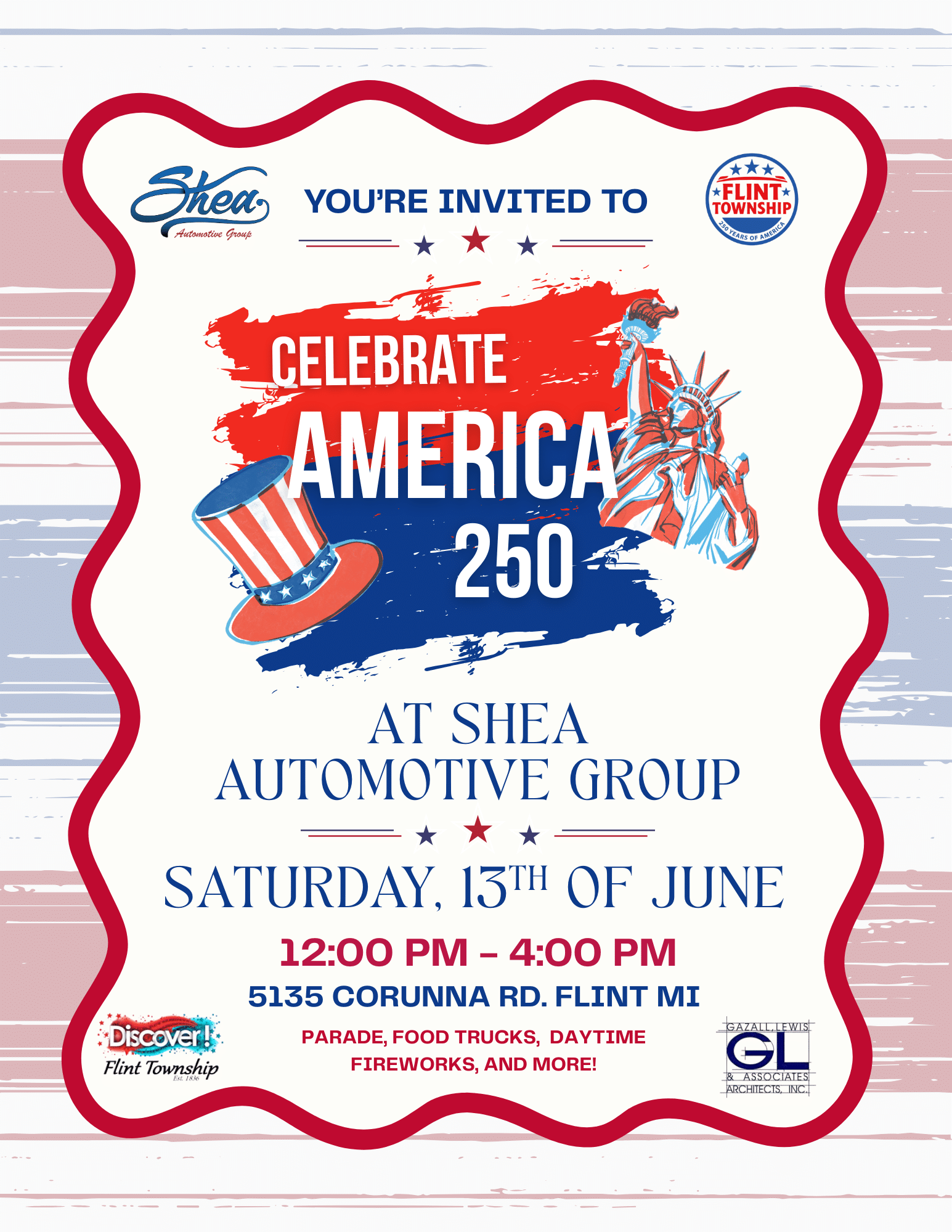 Join Shea Automotive Group and Flint Township as they celebrate America! Bring the family to view a parade, try a food truck, and enjoy fireworks on Saturday, June 13th, from 12-4p.m.