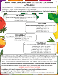 April Flint Mobile Food Pantries announced by the Foodbank of Eastern Michigan, and Michigan Department of Health and Human Services. For more information, call (810) 239-4441 or visit https://www.fbem.org/programs/mobile-pantry-distributions/